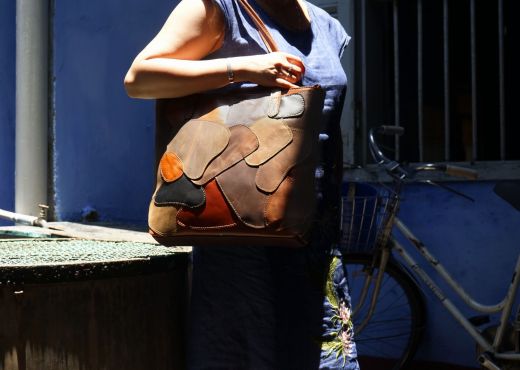 Another classic artistic bag is the patchwork bag that has been around for many, many years. Due to the recent Vintage craze it has become more popular again over the last years. It's an even simpler technique to apply  than the weaving but with a huge effect. If you like a more casual, or messy - for lack of a better word - pattern, then you should take a closer look at the brown patchwork tote bag below.